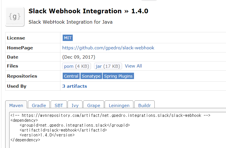 https://mvnrepository.com/artifact/net.gpedro.integrations.slack/slack-webhook/1.4.0