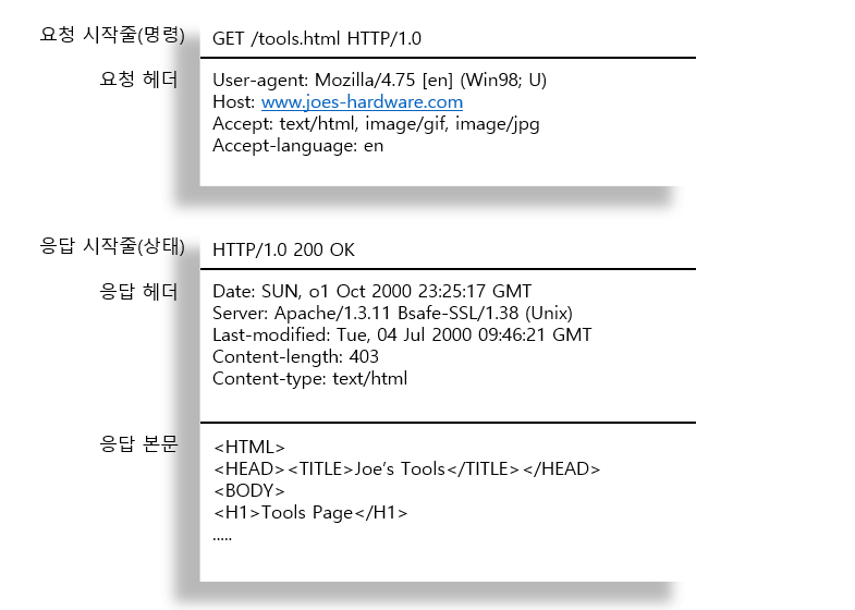 - HTTP 메시지의 세 부분(시작줄, 헤더, 개체 본문)