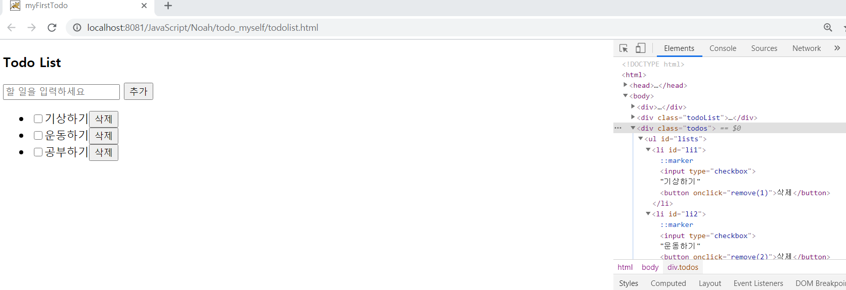 국비교육 41일차, 오늘까지 배운 HTML, CSS, Javascript로 todolist를 직접 만들어 보고 싶어서 기록으로 남긴다!